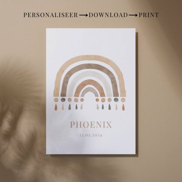 Deze gepersonaliseerde regenboogposter is een prachtige en unieke toevoeging aan elke baby- of kinderkamer. Het ontwerp bevat een stijlvolle regenboog in zachte, neutrale aardetinten, perfect passend bij een boho-interieur. Onderaan de regenboog kun je de naam van het kind en de geboortedatum toevoegen om het echt persoonlijk te maken.