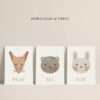 Deze set van drie schattige printbare posters is perfect voor het inrichten van een kinderkamer of speelruimte. De ontwerpen tonen lieve, minimalistische dierengezichten – een vos, een beer en een konijn – in zachte aardetinten. Onder elk dier staat een woord, samen vormend de vrolijke boodschap “Play All Day”. De eenvoudige illustraties en warme kleuren brengen een rustgevende sfeer die tegelijkertijd speels en uitnodigend is.